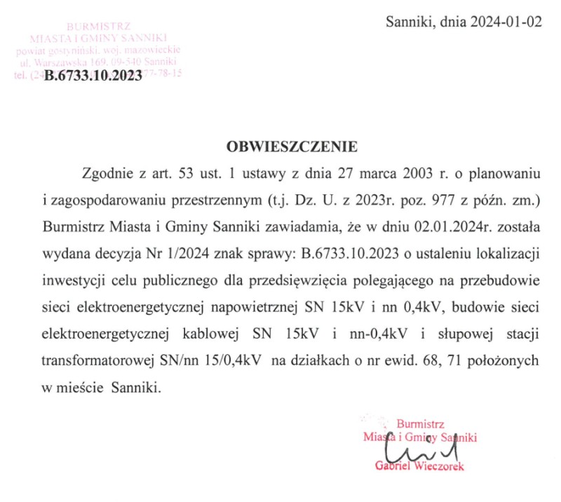 Zgodnie z art. 53 ust. 1 ustawy z dnia 27 marca 2003 r. o planowaniu i zagospodarowaniu przestrzennym (t.j. Dz. U. z 2023r. poz. 977 z późn. zm.) Burmistrz Miasta i Gminy Sanniki zawiadamia, że w dniu 17.07.2024r. została wydana decyzja Nr 5/2024 znak sprawy: B.6733.1.2024 o ustaleniu lokalizacji inwestycji celu publicznego dla przedsięwzięcia polegającego na przebudowie linii elektroenergetycznej napowietrznej SN 15kV relacji Szkarada-Gąbin