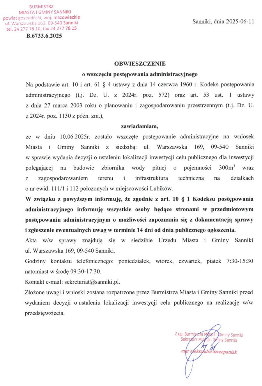 że w dniu 20.11.2024r. zostało wszczęte postępowanie administracyjne na wniosek ENERGA - OPERATOR S.A. z siedzibą w Gdańsku w imieniu której działa Pełnomocnik Pan Zbigniew Zalega reprezentujący Firmę K2Z Zbigniew Zalega w sprawie wydania decyzji o ustaleniu lokalizacji inwestycji celu publicznego dla inwestycji polegającej na budowie sieci elektroenergetycznej kablowej nn-0,4kV wraz ze złączami kablowo-pomiarowymi na działkach o nr ewid. 161/14, 161/26, 161/27, 161/28, 161/29, 161/30. 161/31, 161/32, 161/33, 161/34, 161/35, 161/36, 161/37, 161/38, 161/39, 161/40, 161/41, 161/42, 161/43, 161/44, 161/46, 161/47, 161/48, 161/49, 161/50, 161/51, 161/52, 161/53, 161/54, 161/55, 161/56, 161/57, 161/58 położonych w mieście Sanniki.