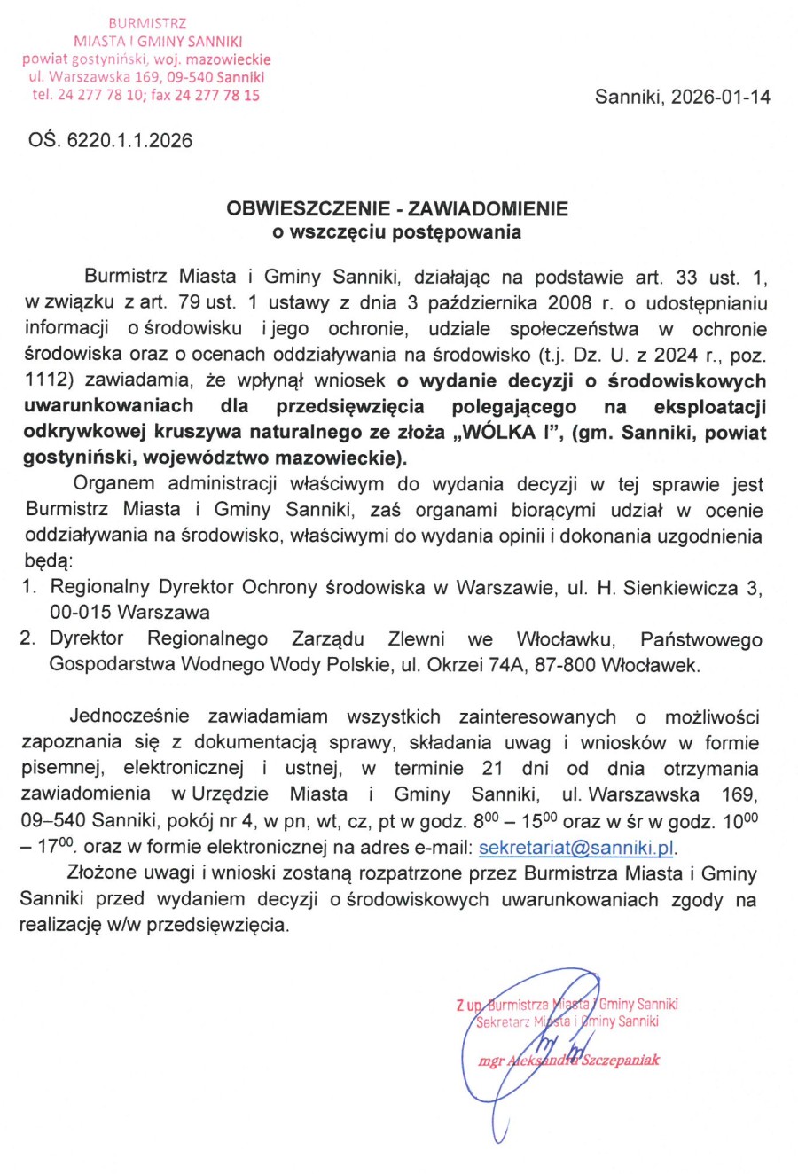 Burmistrz Miasta i Gminy Sanniki, działając na podstawie art. 33 ust. 1, w związku z art. 79 ust. 1 ustawy z dnia 3 października 2008 r. o udostępnianiu informacji o środowisku i jego ochronie, udziale społeczeństwa w ochronie środowiska oraz o ocenach oddziaływania na środowisko (Dz. U. z 2023 r., poz. 1094 j.t. ze zm.) zawiadamia, że w dniu 25. 04. 2024 r. wpłynął wniosek o wydanie decyzji o środowiskowych uwarunkowaniach dla przedsięwzięcia polegającego na: „wydzieleniu z działki o numerze 303/2 w Wólka gmina Sanniki 13 sztuk działek budowlanych do budowy budynków mieszkalnych jednorodzinnych z niezbędną infrastrukturą towarzyszącą (w tym budowa bezodpływowego zbiornika na nieczystości stałe) oraz ciągów komunikacyjnych i zagospodarowaniem terenu”, pow. gostyniński, woj. mazowieckie.