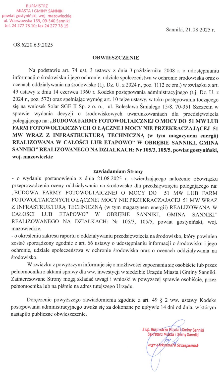 Burmistrz Miasta i Gminy Sanniki, działając na podstawie art. 33 ust. 1 w związku z art. 79 ust. 1 ustawy z dnia 3 października 2008 r. o udostępnianiu informacji o środowisku i jego ochronie, udziale społeczeństwa w ochronie środowiska oraz o ocenach oddziaływania na środowisko (Dz. U. z 2023 r., poz. 1094 ze zm.)