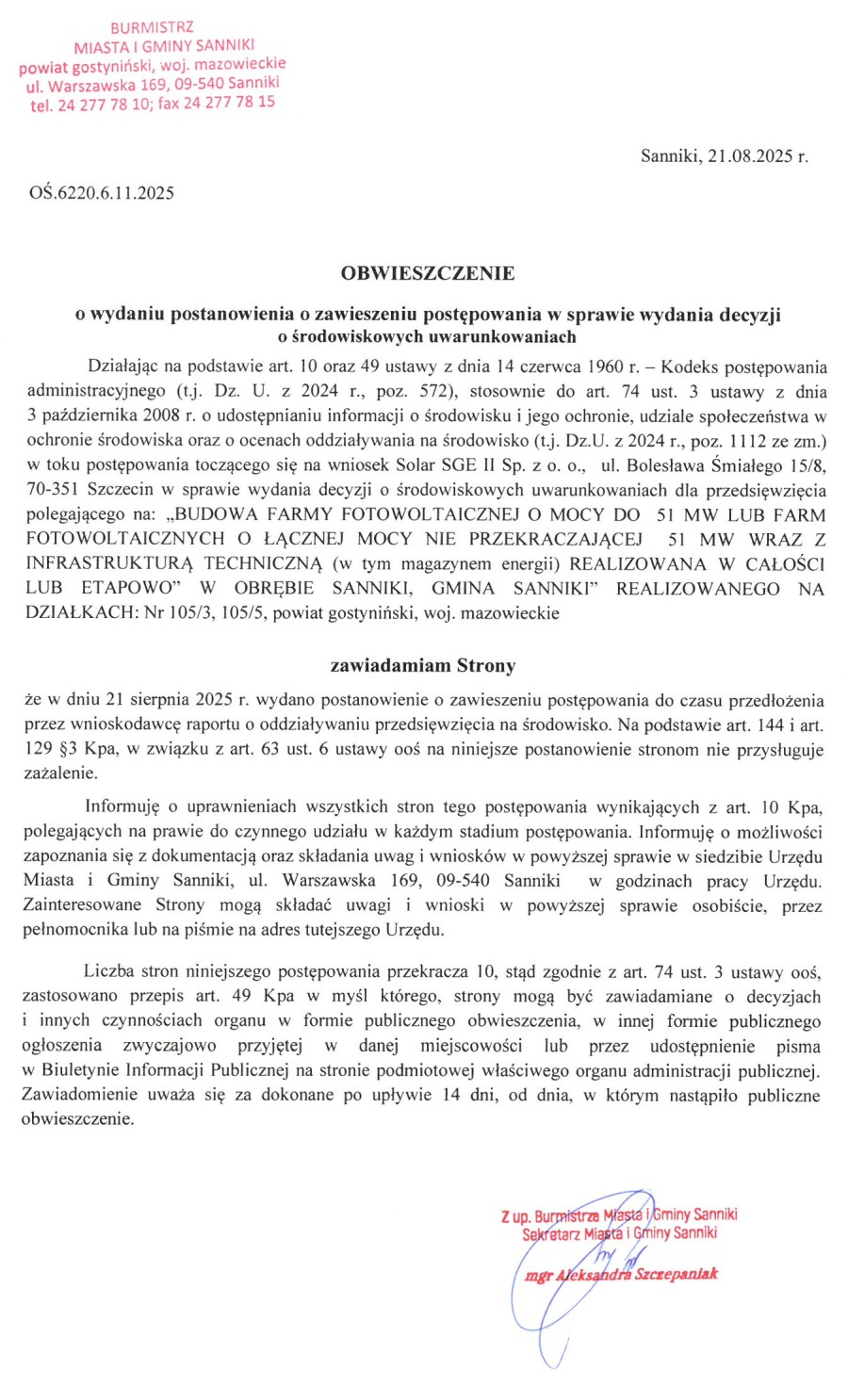 Jednocześnie zawiadamiam wszystkich zainteresowanych o możliwości zapoznania się z dokumentacją sprawy, składania uwag i wniosków w formie pisemnej, elektronicznej i ustnej, w terminie 21 dni od dnia otrzymania zawiadomienia w Urzędzie Miasta i Gminy Sanniki, ul. Warszawska 169,