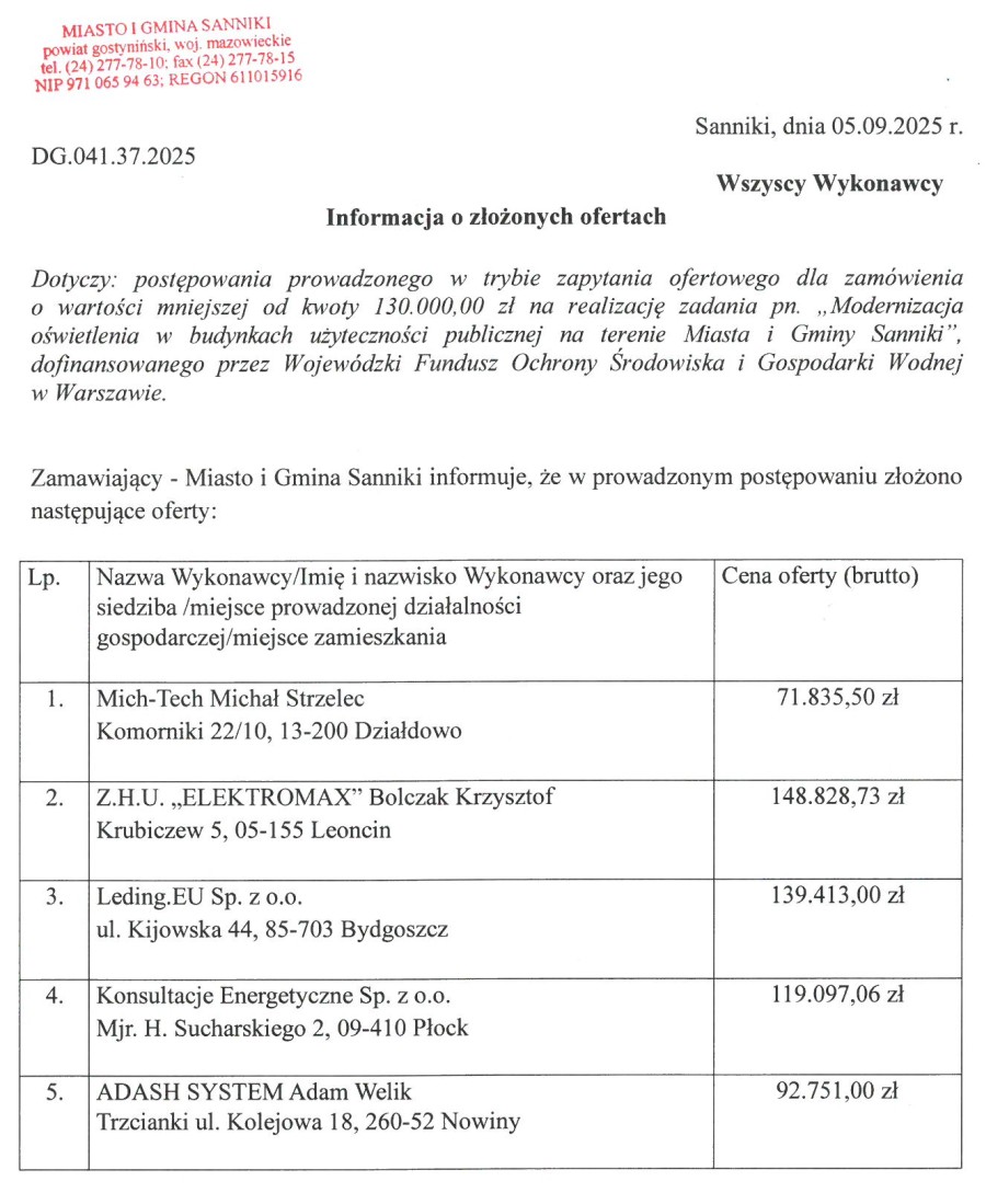 Miasto i Gmina Sanniki Firmy, które złożyły oferty cenowe