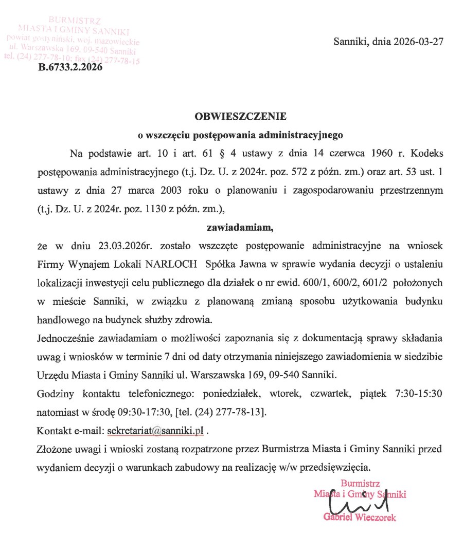 że w dniu 20.11.2024r. zostało wszczęte postępowanie administracyjne na wniosek ENERGA - OPERATOR S.A. z siedzibą w Gdańsku w imieniu której działa Pełnomocnik Pan Zbigniew Zalega reprezentujący Firmę K2Z Zbigniew Zalega w sprawie wydania decyzji o ustaleniu lokalizacji inwestycji celu publicznego dla inwestycji polegającej na budowie sieci elektroenergetycznej kablowej nn-0,4kV wraz ze złączami kablowo-pomiarowymi na działkach o nr ewid. 161/14, 161/26, 161/27, 161/28, 161/29, 161/30. 161/31, 161/32, 161/33, 161/34, 161/35, 161/36, 161/37, 161/38, 161/39, 161/40, 161/41, 161/42, 161/43, 161/44, 161/46, 161/47, 161/48, 161/49, 161/50, 161/51, 161/52, 161/53, 161/54, 161/55, 161/56, 161/57, 161/58 położonych w mieście Sanniki.