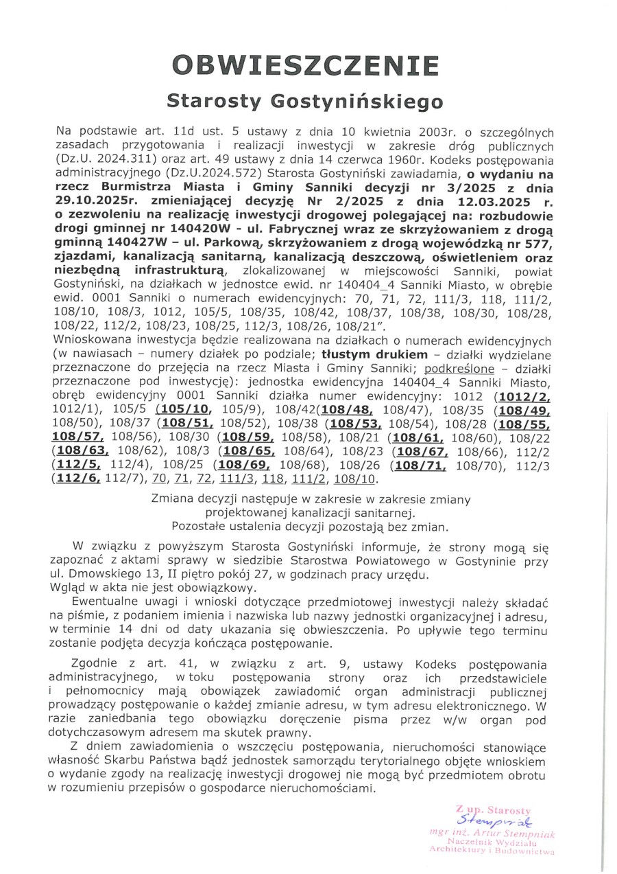 Na podstawie art. 11d ust. 5 ustawy z dnia 10 kwietnia 2003 r. o szczególnych zasadach przygotowania i realizacji inwestycji w zakresie dróg publicznych (Dz. U. z 2024 r., poz. 311 ze zm.) zawiadamia się, że zostało wszczęte postępowanie z wniosku inwestora: Zarządu Województwa Mazowieckiego, ul. Jagiellońska 26, 03-719 Warszawa, w imieniu którego działa Mazowiecki Zarząd Dróg Wojewódzkich w Warszawie, ul. Kolejowa 5/7, 01-217 Warszawa, działającego poprzez pełnomocnika – Pana Marcina Łukasiewicza, złożonego w tutejszym organie w dniu 10 stycznia 2025 r., uzupełnionego w dniu 28 marca 2025 r., zmienionego w dniu 12 czerwca 2025 r. oraz uzupełnionego w dniu 31 lipca 2025 r., w sprawie wydania decyzji o zezwoleniu na realizację inwestycji drogowej pn.: „Rozbudowa drogi wojewódzkiej nr 577 na odcinku od km 19+183 do km 22+839 m. Czyżew, gm. Sanniki, powiat gostyniński oraz m. Konstantynów, gm. Gąbin, powiat płocki.” Stronami postępowania w sprawie są wnioskodawca, właściciele lub użytkownicy wieczyści nieruchomości objętych wnioskiem (powiadomieni w drodze zawiadomień). Działki usytuowania obiektu: inwestycja zlokalizowana jest na terenie gminy Sanniki, powiat gostyniński oraz na terenie gminy Gąbin, powiat płocki, województwo mazowieckie. - numery działek w istniejącym pasie drogowym drogi wojewódzkiej będących własnością Województwa Mazowieckiego, powiat gostyniński, gmina Sanniki, jedn. ew. 140404_5 Sanniki- gmina, obręb 0005 Czyżew, dz. ew. nr: 110/2, 110/1, 68/2, 69/1, 70/1, 71/2, 224/1, 225/5, 225/7, 227/1, 228/1, 230/1, 231/1, 232/1, 433/1, 434/3, 436/1, 438/1, 437/1, 439/1, 441/1, 442/1, 443/3, 443/4, 444/3, 444/5, 445/1, 446/3, 446/5, 447/1, 448/3, 448/5, 449/1, 450/1, 451/1, 455/1, 452/1, jedn. ew. 140404_4 Sanniki miasto, obręb 0001 Sanniki, dz. ew. nr: 21/1, 21/2, 23/1, 72, powiat płocki, gmina Gąbin, jedn. ew. 141906_5 Gąbin- obszar wiejski obręb 0016 Konstantynów, dz. ew. nr: 123/1, - numery działek w projektowanym pasie drogowym, podlegające podziałowi, przechodzące na rzecz Skarbu Państwa lub właściwej jednostki samorządu terytorialnego- (w nawiasach numery działek po podziale, tłustym drukiem numery działek przeznaczone do przejęcia pod inwestycję): powiat gostyniński gmina Sanniki, jedn. ew. 140404_5 Sanniki- gmina, obręb 0005 Czyżew, dz. ew. nr: 398 (398/1, 398/2 , 398/3), 1 (1/1, 1/2, 1/3), 2 (2/1, 2/2), 3 (3/1, 3/2), 4 (4/1, 4/2), 5 (5/1, 5/2), 7/3 (7/8, 7/9), 7/4 (7/10, 7/11), 9 (9/1, 9/2), 10/1 (10/2, 2 10/3), 12 (12/1, 12/2), 13 (13/1, 13/2), 14/1 (14/5, 14/6), 14/2 (14/7, 14/8), 14/3 (14/9, 14/10), 16/2 (16/4, 16/5), 16/3 (16/6, 16/7), 17 (17/1, 17/2), 18 (18/1, 18/2), 19/2 (19/3, 19/4), 20 (20/1, 20/2), 21 (21/1, 21/2), 22 (22/1, 22/2), 23 (23/1, 23/2), 24 (24/1, 24/2), 25 (25/1, 25/2), 26/1 (26/3, 26/4), 26/2 (26/5, 26/6), 27 (27/1, 27/2), 33 (33/1, 33/2), 34 (34/1, 34/2), 35/1 (35/2, 35/3), 36 (36/1, 36/2), 37 (37/1, 37/2), 39 (39/1, 39/2), 52/3 (52/4, 52/5), 54/1 (54/2, 54/3), 55/1 (55/2, 55/3), 56/1 (56/2, 56/3), 57/3 (57/4, 57/5), 59/1 (59/2, 59/3, 59/4), 60/1 (60/2, 60/3), 61 (61/1, 61/2, 61/3), 68/3 (68/4, 68/5, 68/6), 70/2 (70/3, 70/4), 71/3 (71/4, 71/5), 73 (73/1, 73/2), 74 (74/1, 74/2), 362 (362/1, 362/2), 75 (75/1, 75/2), 76/2 (76/4, 76/5), 310/1 (310/2, 310/3), 112/4 (112/9, 112/10, 112/11), 113 (113/1, 113/2), 114 (114/1, 114/2), 115 (115/1, 115/2), 116/1 (116/2, 116/3), 118 (118/1, 118/2), 119/2 (119/4, 119/5), 121 (121/1, 121/2), 122 (122/1, 122/2), 123 (123/1, 123/2), 124 (124/1, 124/2), 125 (125/1, 125/2), 126 (126/1, 126/2), 127 (127/1, 127/2), 128 (128/1, 128/2), 363 (363/1, 363/2),129 (129/1, 129/2), 130 (130/1, 130/2), 131 (131/1, 131/2), 132 (132/1, 132/2), 133/1 (133/6, 133/7), 133/2 (133/8, 133/9), 134 (134/1, 134/2), 135 (135/1, 135/2), 136 (136/1, 136/2), 137 (137/1, 137/2), 138/1 (138/2, 138/3), 142/1 (142/2, 142/3), 143/1 (143/2, 143/3), 174/1 (174/2, 174/3), 175/2 (175/4, 175/5), 179/1 (179/2, 179/3), 182/1 (182/2,182/3), 183/1 (183/2, 183/3), 186/1 (186/3, 186/4), 188/3 (188/4, 188/5), 192/1 (192/2, 192/3), 195/1 (195/2, 195/3), 199/1 (199/2, 199/3), 200/1 (200/2, 200/3), 364/1 (364/2, 364/3), 209/1 (209/2, 209/3), 212/1 (212/2, 212/3), 213/1 (213/2, 213/3), 214/1 (214/2, 214/3), 215/2 (215/4, 215/5), 215/3 (215/6, 215/7), 219/1 (219/15, 219/16), 219/7 (219/12, 219/13, 219/14), 219/4 (219/10, 219/11), 221 (221/1, 221/2), 222 (222/1, 222/2, 222/3), 223 (223/1, 223/2), 368 (368/1, 368/2), 224/2 (224/3, 224/4, 224/5), 229 (229/3, 229/4), 232/2 (232/3, 232/4), 308 (308/1, 308/2), 433/2 (433/3, 433/4, 433/5), 440 (440/3, 440/4), - numery działek w projektowanym pasie drogowym, do przejęcia w całości pod inwestycję, przechodzące na rzecz Skarbu Państwa lub właściwej jednostki samorządu terytorialnego: powiat gostyniński gmina Sanniki, jedn. ew. 140404_5 Sanniki- gmina, obręb 0005 Czyżew, dz. ew. nr: 219/6, - numery działek podlegających ograniczeniu, niewchodzących w skład projektowanego pasa drogowego, przeznaczonych pod budowę/przebudowę/rozbudowę sieci uzbrojenia terenu, urządzeń wodnych lub urządzeń melioracji wodnych szczegółowych, innych dróg publicznych, zjazdów oraz rozbiórki istniejących obiektów budowlanych (w nawiasie numer działki przed podziałem): powiat gostyniński gmina Sanniki, jedn. ew. 140404_5 Sanniki- gmina, obręb 0005 Czyżew, dz. ew. nr: 398/2 (398), 221/2 (221), 308/2 (308), 202/1, 461, 442/2, 35/3 (35/1), 36/2 (36), 42, 59/4 (59/1), 61/2 (61), 68/6 (68/3), 76/3, 78, 79/1, 81, 82, 83/1, 84/1, 85/1, 87/1, 310/3 (310/1), 112/11 (112/4), 112/5, 112/6, 113/2 (113), 114/2 (114), 115/2 (115), 116/3 (116/1), 118/2 (118), 119/5 (119/2), 121/2 (121), 122/2 (122), 123/2 (123), 124/2 (124), 125/2 (125), 126/2 (126), 127/2 (127), 128/2 (128), 129/2 (129), 363/2 (363), 130/2 (130), 131/2 (131), 132/2 (132), 133/7 (133/1), 133/9 (133/2), 134/2 (134), 135/2 (135), 136/2 (136), 137/2 (137), 138/3 (138/1), 142/3 (142/1