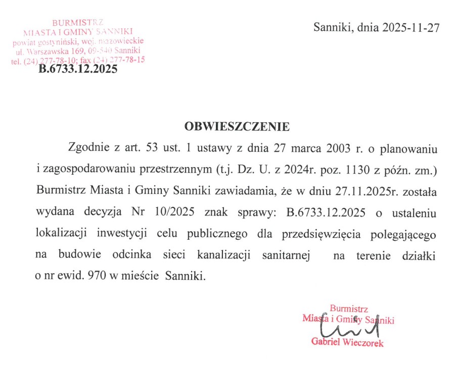 Zgodnie z art. 53 ust. 1 ustawy z dnia 27 marca 2003 r. o planowaniu i zagospodarowaniu przestrzennym (t.j. Dz. U. z 2024r. poz. 1130 z późn. zm.) Burmistrz Miasta i Gminy Sanniki zawiadamia, że w dniu 12.02.2025r. została wydana decyzja Nr 2/2025 znak sprawy: B.6733.7.2024 o ustaleniu lokalizacji inwestycji celu publicznego dla przedsięwzięcia polegającego na budowie sieci elektroenergetycznej kablowej nn-0,4kV wraz ze złączami kablowo-pomiarowymi na działkach o nr ewid. 161/14, 161/26, 161/27, 161/28, 161/29, 161/30. 161/31, 161/32, 161/33, 161/34, 161/35, 161/36, 161/37, 161/38, 161/39, 161/40, 161/41, 161/42, 161/43, 161/44, 161/46, 161/47, 161/48, 161/49, 161/50, 161/51, 161/52, 161/53, 161/54, 161/55, 161/56, 161/57, 161/58 położonych w mieście Sanniki.