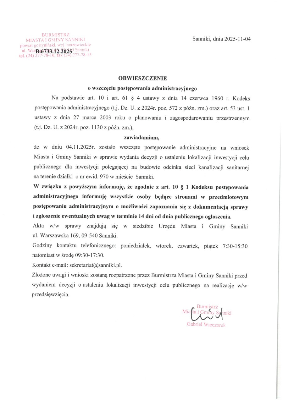 że w dniu 20.11.2024r. zostało wszczęte postępowanie administracyjne na wniosek ENERGA - OPERATOR S.A. z siedzibą w Gdańsku w imieniu której działa Pełnomocnik Pan Zbigniew Zalega reprezentujący Firmę K2Z Zbigniew Zalega w sprawie wydania decyzji o ustaleniu lokalizacji inwestycji celu publicznego dla inwestycji polegającej na budowie sieci elektroenergetycznej kablowej nn-0,4kV wraz ze złączami kablowo-pomiarowymi na działkach o nr ewid. 161/14, 161/26, 161/27, 161/28, 161/29, 161/30. 161/31, 161/32, 161/33, 161/34, 161/35, 161/36, 161/37, 161/38, 161/39, 161/40, 161/41, 161/42, 161/43, 161/44, 161/46, 161/47, 161/48, 161/49, 161/50, 161/51, 161/52, 161/53, 161/54, 161/55, 161/56, 161/57, 161/58 położonych w mieście Sanniki.